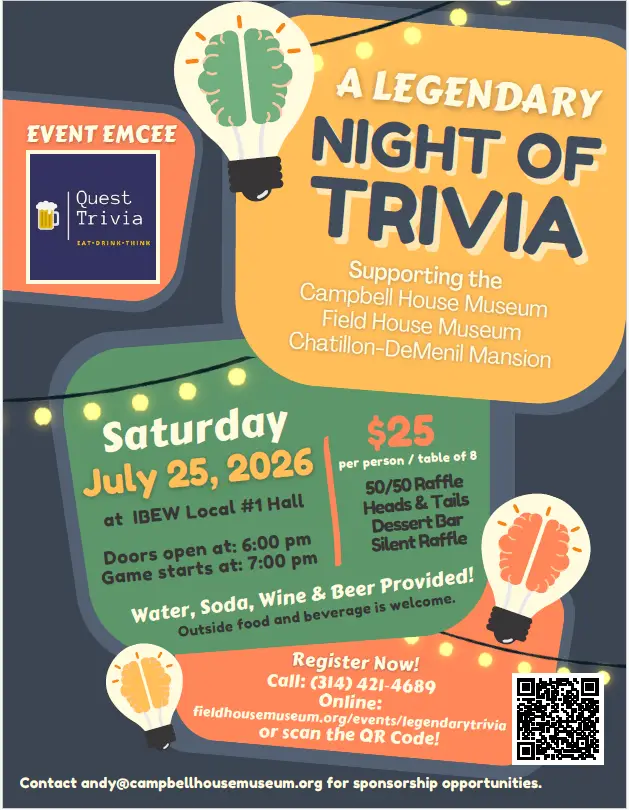 Annual trivia night fundraiser and silent auction to benefit the Campbell House Museum, DeMenil Mansion and Field House Museum.