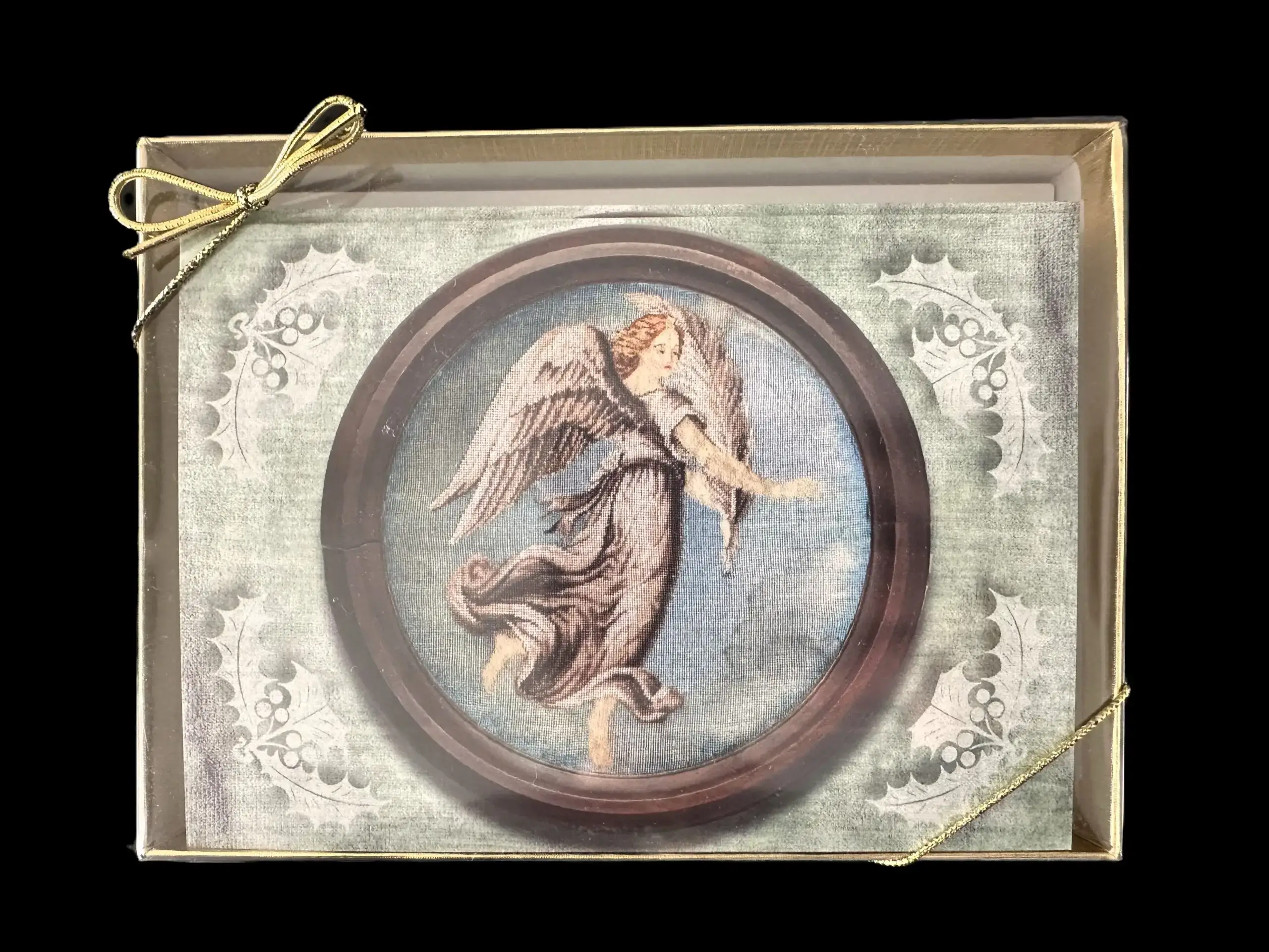Exclusive Campbell House Christmas card for 2025 features a photograph of an antique hand embroidered angel from the Campbell House collection. Ten cards with envelopes in a gold box. Inside message reads “Merry Christmas and Happy New Year!”
